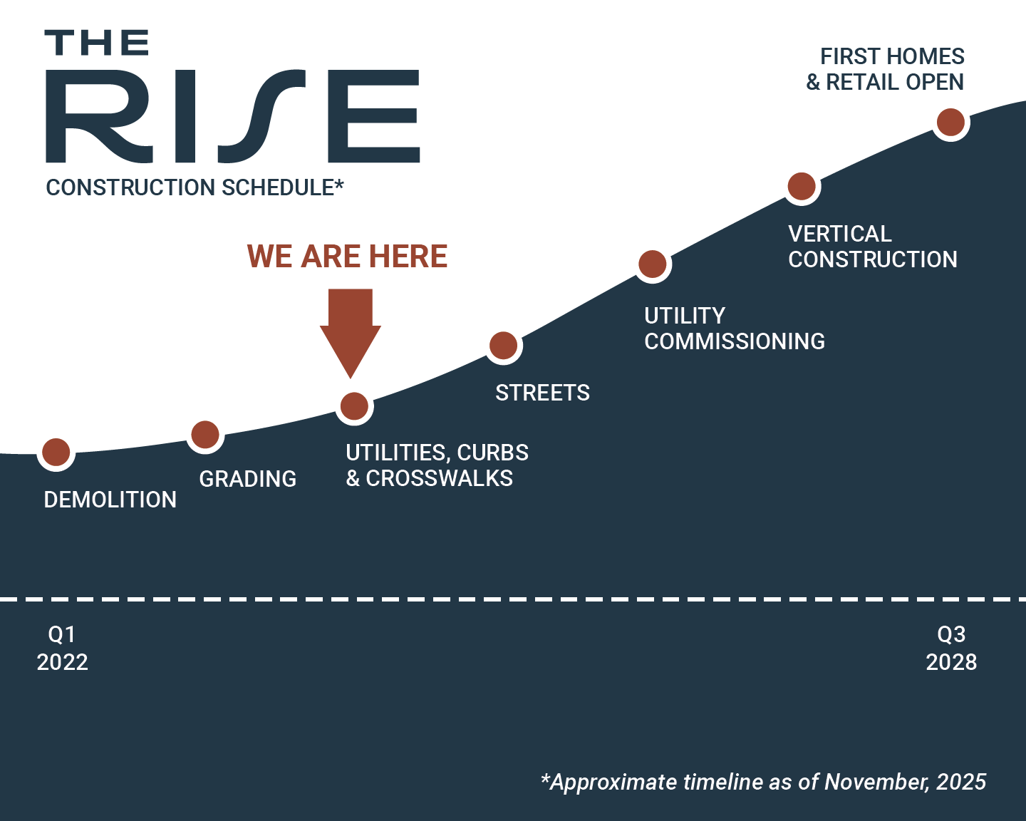 With summer grading complete, we are commencing the next permitted sequence of construction at The Rise to install infrastructure serving the initial homes, retail, parks, and public spaces.